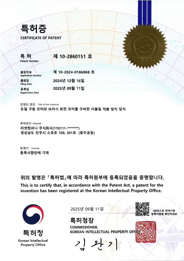 특허_제10-2860151호_듀얼 구동 모터와 브러시 회전 모터를 구비한 이물질 적층 방지 장치(Patent_No.2860151 Foreign Substance Accumulation Prevention Device Equipped with Dual-Drive Motor and Brush Rotation Motor)
